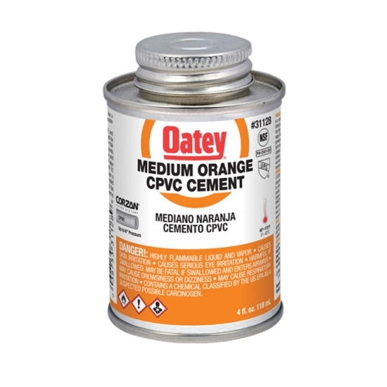 Medium Body CPVC Cement, Size: 4 OZ, Container Type: Can, Orange Color, Form: Translucent Liquid, Odor: Solvent, Dry Time: 1 - 2 MIN At 70 - 90 DEG F, Temperature Rating: 40 - 110 DEG F, Specific Gravity: 0.94 Plus/Minus 0.02, Flash Point: 14 - 23 DEG F, VOC: 490 G/L, Industry Standards: NSF Standard 61 For PW, DWV And Sewer Waste, IAPMO Certified, Meets California South Coast Air Quality Management District SCAQMD 1168/316A Or BAAQMD Method 40, Meets ASTM F-493 And ASTM D-2846, Additional Specifications: Viscosity: 500 CP Minimum, Shelf Life: 2 YR, Boiling Point: 151 DEG F