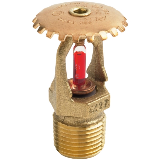FireLock Standard Spray Sprinkler Head, Series/Model: Model V2710, Size: 1/2 IN, 1/2 IN Orifice, Connection Type: MNPT, 1-1/4 IN Width Deflector, 5.6 K Factor, Deflector Type: Horizontal Sidewall, Response Type: Quick, Maximum Pressure: FM: 175 PSI, UL: 250 PSI, 3 MM Red Bulb Element, All Hazard, Wrench: V27-2 Recessed, V27 Open End, Bronze Deflector, Die Cast Brass 65-30 Frame, Bulb Material: Glass With Glycerin Solution, Material Specification: Deflector: UNS C22000, Finish/Color: Plain Brass, Temperature Rating: 155 DEG F, 3 IN Height, Industry Standards: C/US UL Listed, FM, NYC/MEA 62-99-E, CSFM 7690-0531:112, LPCB, VNIIPO And CTP Approved, Domestic/Import: Import, Additional Specifications: Minimum Operating Pressure: 7 PSI, Factory Hydrostatic Test: 100% At 500 PSI, Ambient Temperature Rating: 100 DEG F