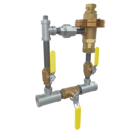 The Viking model D-2 air pressure maintenance device is a pressure regulator that automatically reduces the supply air pressure to a preset requirement when connected to a constantly maintained air supply. The preassembled device comes standard with all necessary valves , unions and trim to allow isolation and bypass.