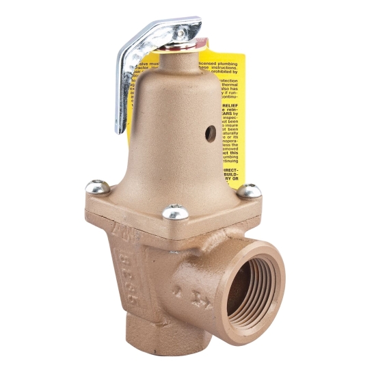 This 1-1/4 IN boiler pressure relief valve is used in hot water space heating boiler applications to protect against excessive pressure on all types of hot water space heating boiler equipment. It consists of an iron body construction with expanded outlet drain connections for hot water space heating boilers, non-metallic disc-to-metal seating, stainless steel spring, and test lever. It offers large discharge capacity, resists corrosive water conditions, resists sticking and freezing, and prevents water and sediment from being trapped in the seat. It is designed for emergency safety relief, not as an operating control. The pressure relief is set at 40 PSI (275.8 KPA) with corresponding high pressure ratings up to 2590000 BTU/HR.